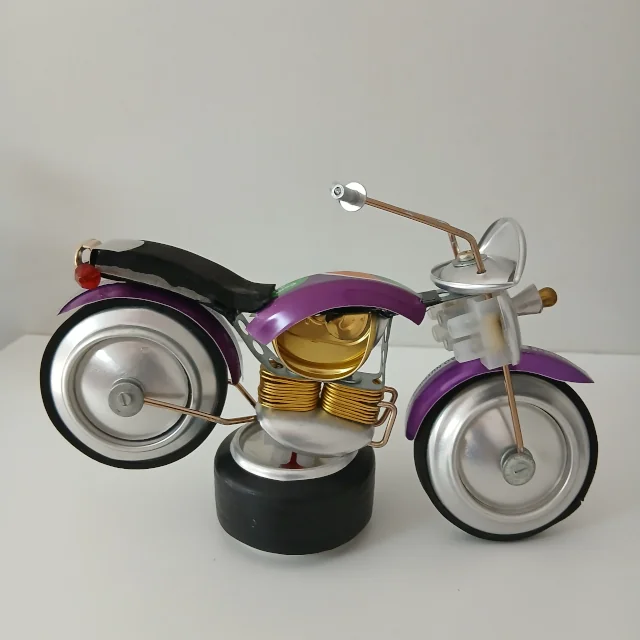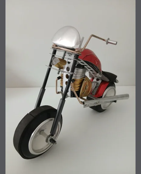 Réplicas de motos clássicas (Harley, chopper) em miniatura, feitas com latas, parafusos e sucata. Pra colecionadores e amantes de velocidade sustentável.