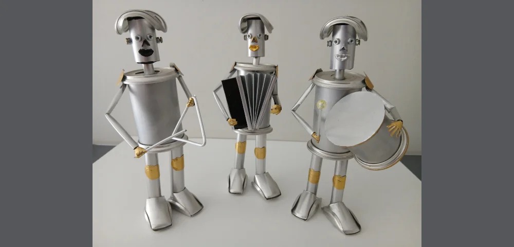 Robôs futuristas, steampunk e digitais feitos com latas, parafusos, missangas e sucata. Peças únicas para quem ama tecnologia reciclada.
