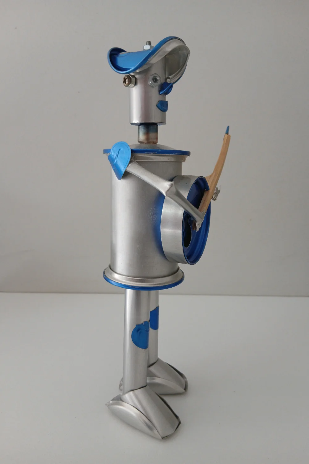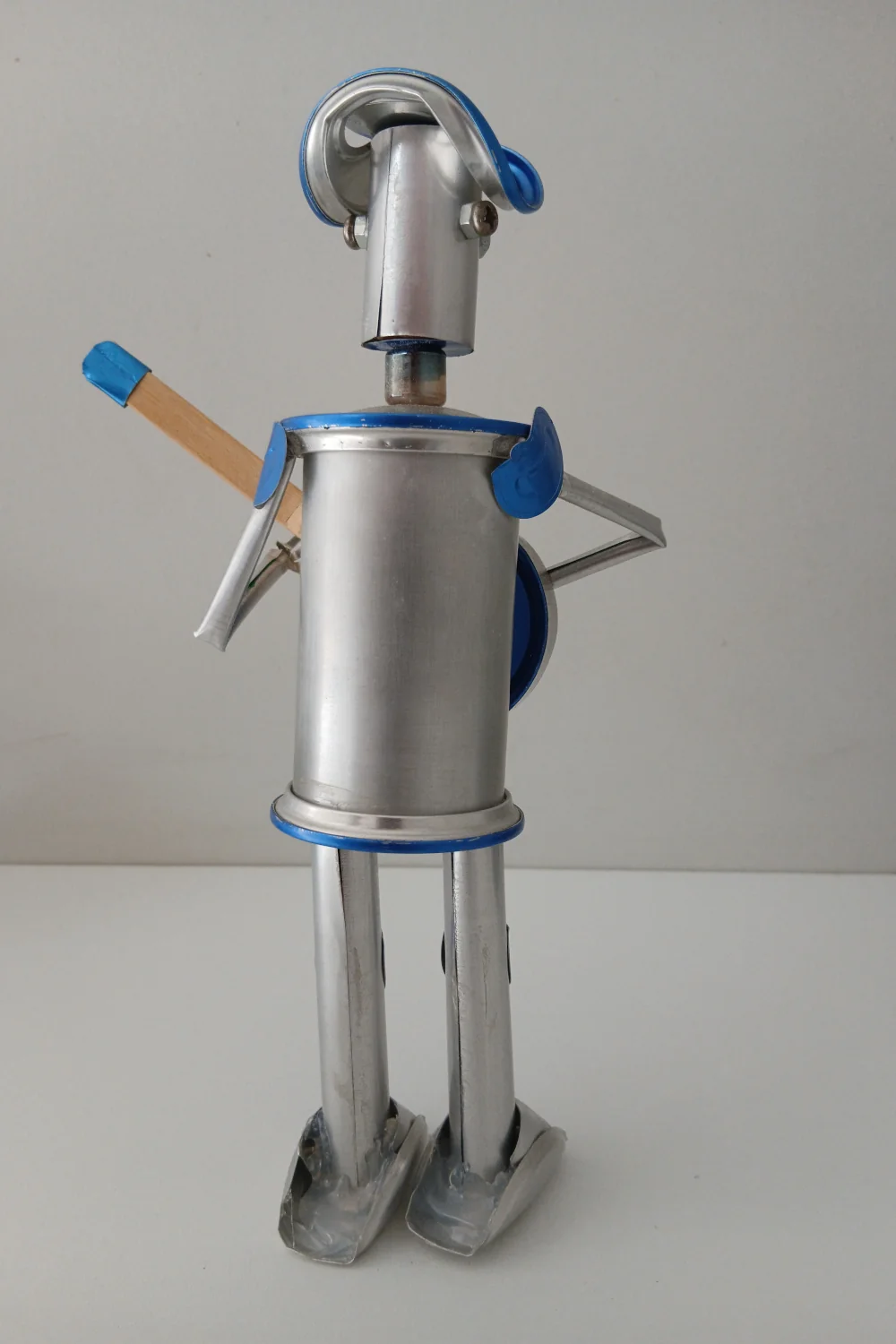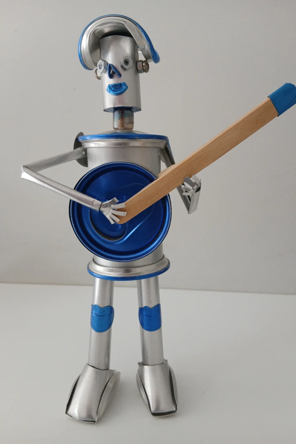 Guitarrista azul articulado em estilo steampunk, feito à mão com latas de alumínio recicladas, porcas, parafusos, palito de picolé, missanga e cola quente. Peça única e ecológica para fãs de música. Pequenas variações naturais em novas produções sob encomenda. Envio com embalagem reforçada para proteção total.