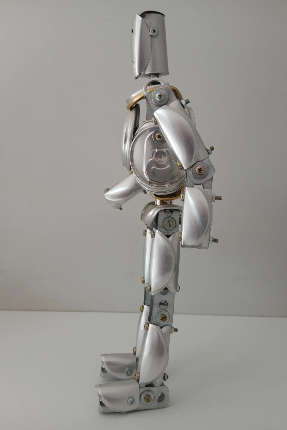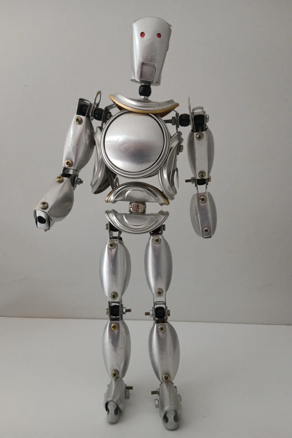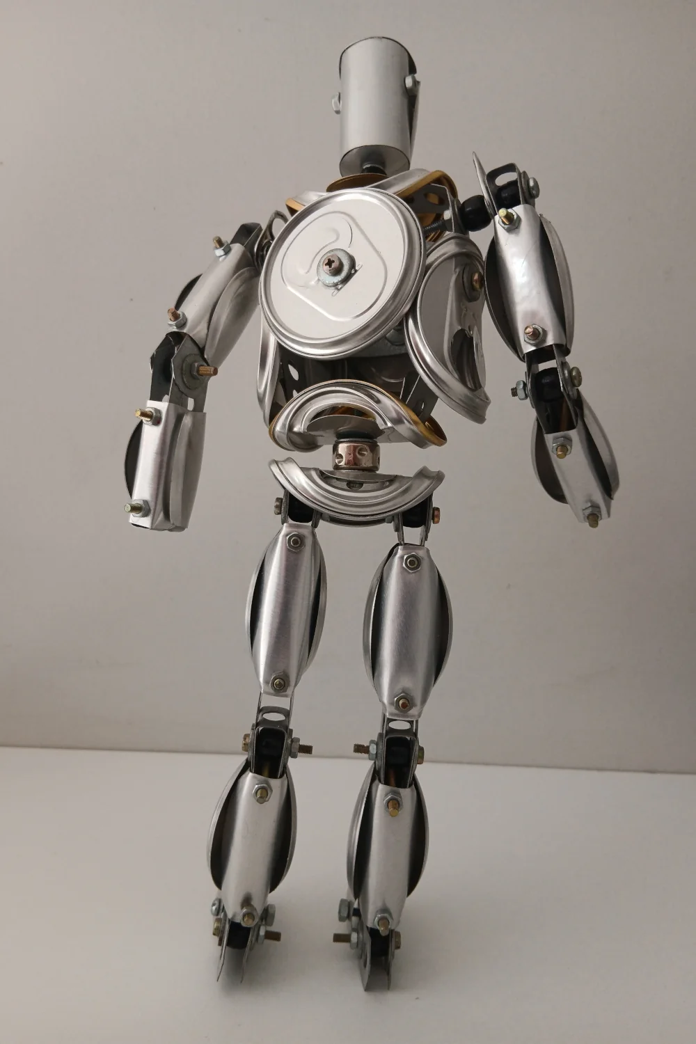 Peça única artesanal em forma de robô prateado.